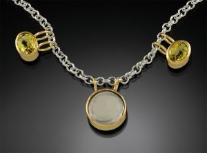 Silver and Gold Rose and Lemon Quartz Necklace. 18K yellow gold and sterling silver necklace with bezel set rose and lemon Quartz gemstones. The chain is sterling silver, and the bezels are 18K yellow gold.