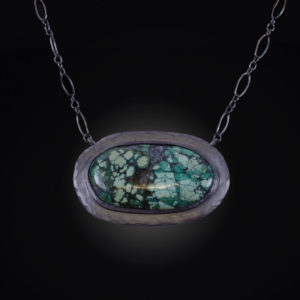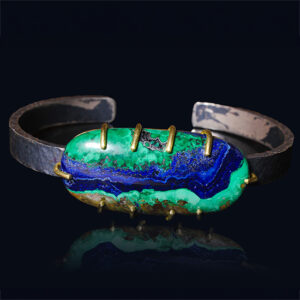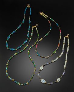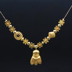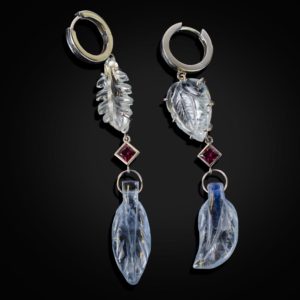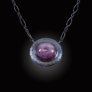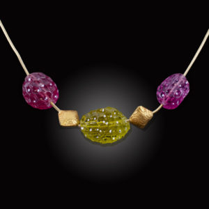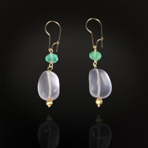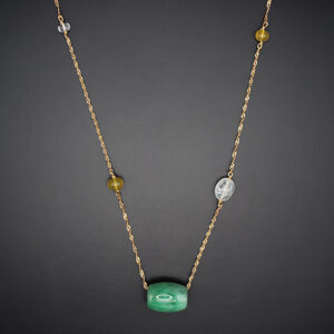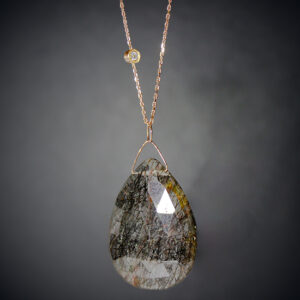• 18K rose gold necklace with 46.5 ct Gem Silica surrounded by multicolored Sapphire briolette beads